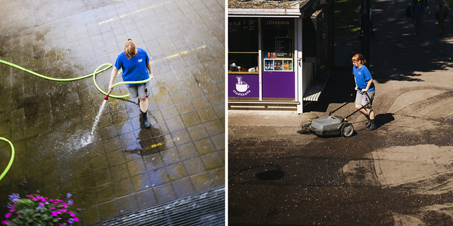 – Tänä kesänä olemme kokeilleet antaa tiimin tehdä keskenään työnjakoa vuorojen alussa. Tarkoitus on opettaa ja vahvistaa työntekijöiden yhteistyö- ja vuorovaikutustaitoja, vastuunottoa, itsenäistä päätöksentekoa sekä kykyä suunnitella ja organisoida työtä yhdessä. Se toimii, kunhan valvotaan, että kaikki työt tulevat varmasti tehtyä. Kävijämäärät ovat niin suuria, että esimerkiksi asiakkaiden pukuhuoneet ja wc-tilat täytyy siivota noin tunnin välein.